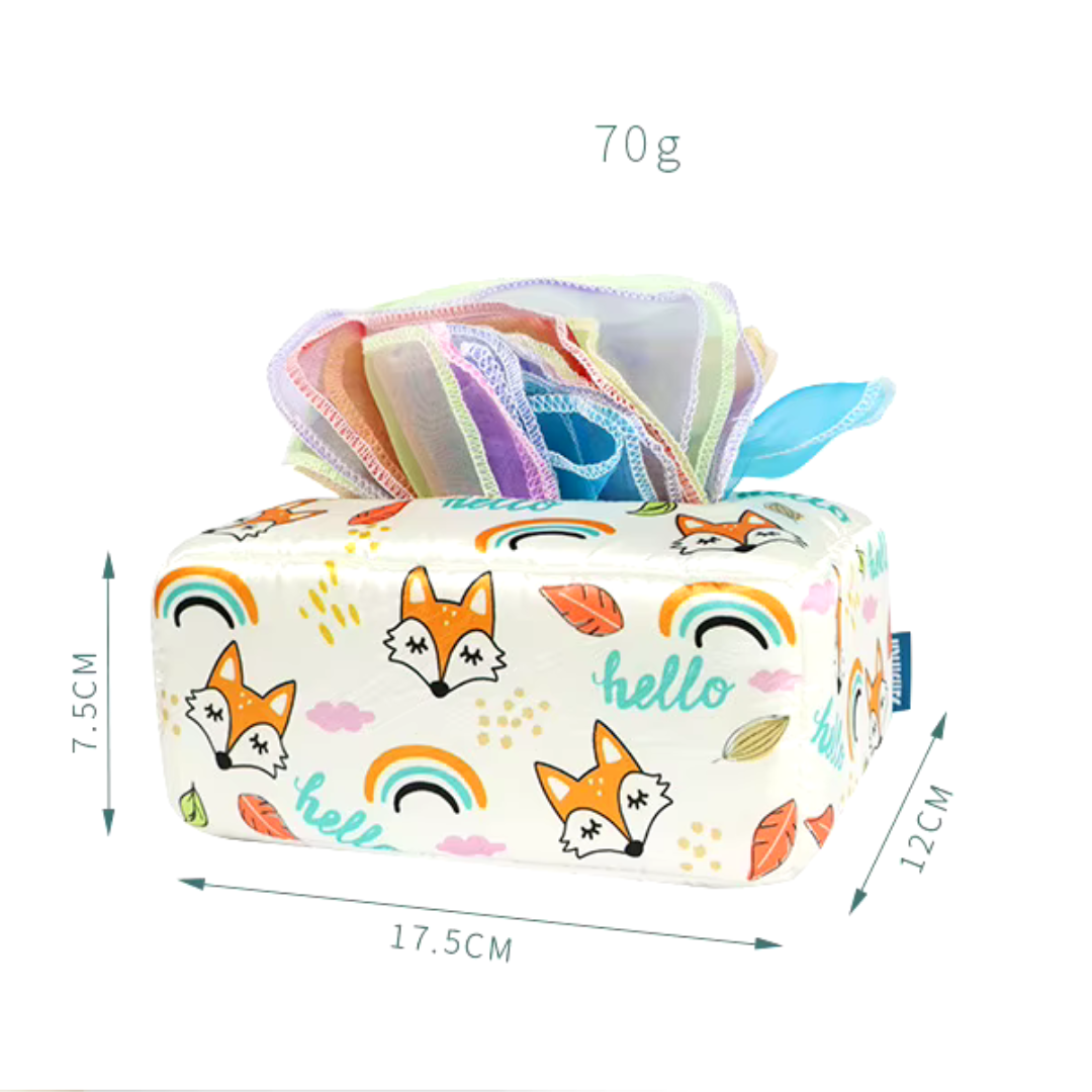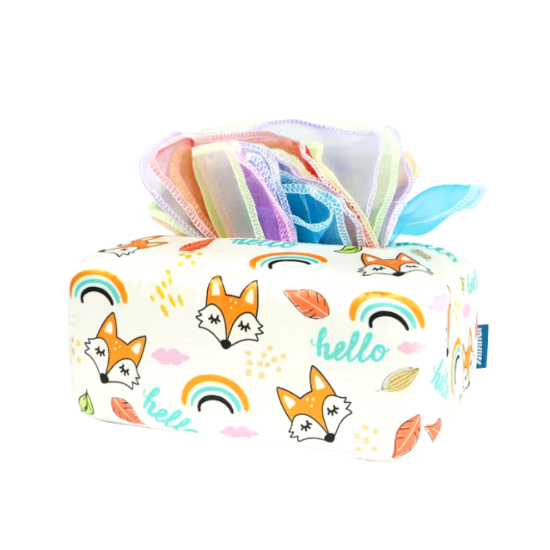KleurenKracht Sensoriska Näsdukslåda är speciellt utformad för nyfikna bebisar och småbarn. Denna Montessori-leksak kombinerar färgglada tygbitar med en mjuk, säker låda som uppmuntrar till att greppa, känna och utforska.