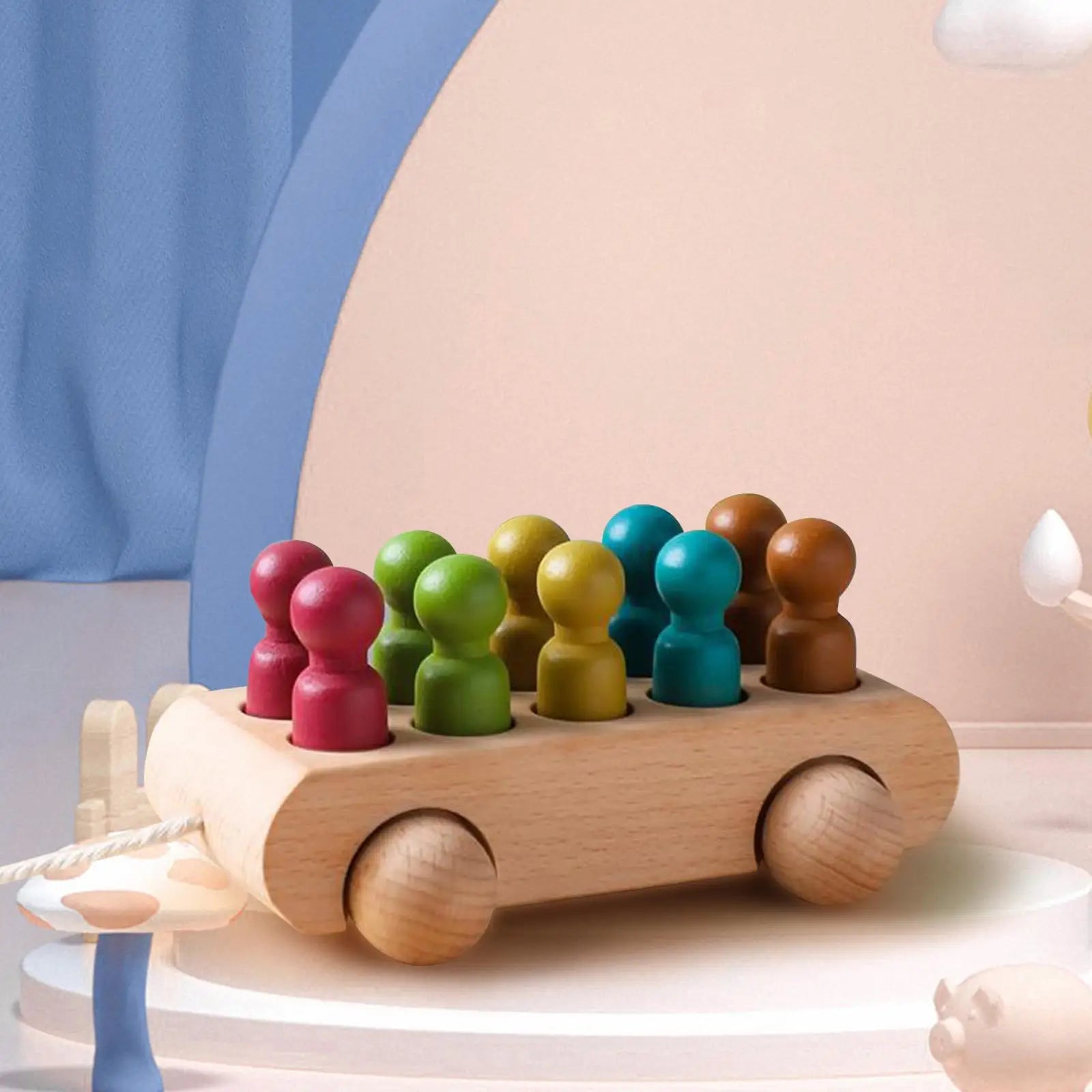 Våra träbilar och regnbågsfärgade figurer hjälper barn att utveckla hand-öga-koordination och finmotoriska färdigheter. När de placerar figurerna i och tar ut dem ur bilarna förbättrar de sitt grepp och sin precision.