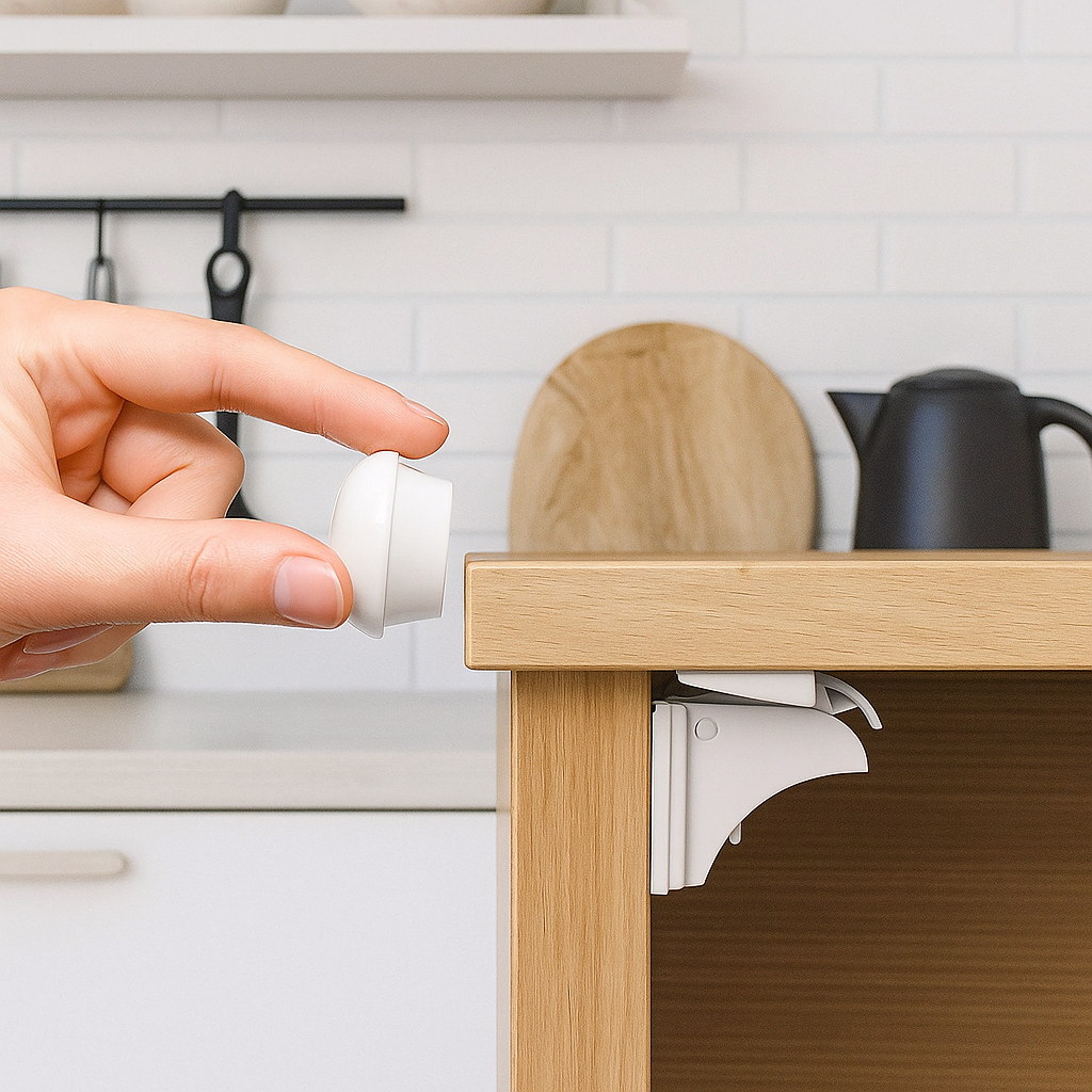 SafeSpace Click barnlåset är perfekt för föräldrar som värdesätter säkerhet, bekvämlighet och inredning. Fäst låset enkelt på insidan av skåp eller låda med den starka självhäftande ytan. Lås upp med magnetnyckeln när det behövs. Tack vare den smarta designen syns de inte från utsidan – du behåller hemmets stil utan att kompromissa med barnsäkra lösningar.