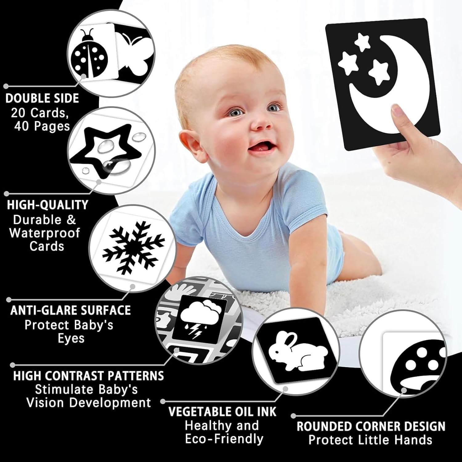 VisionBook stimulerar ditt barns visuella utveckling med kontrastrika bilder som fångar uppmärksamheten och väcker nyfikenheten. Det bidrar också till utvecklingen av öga-hand-koordination.
